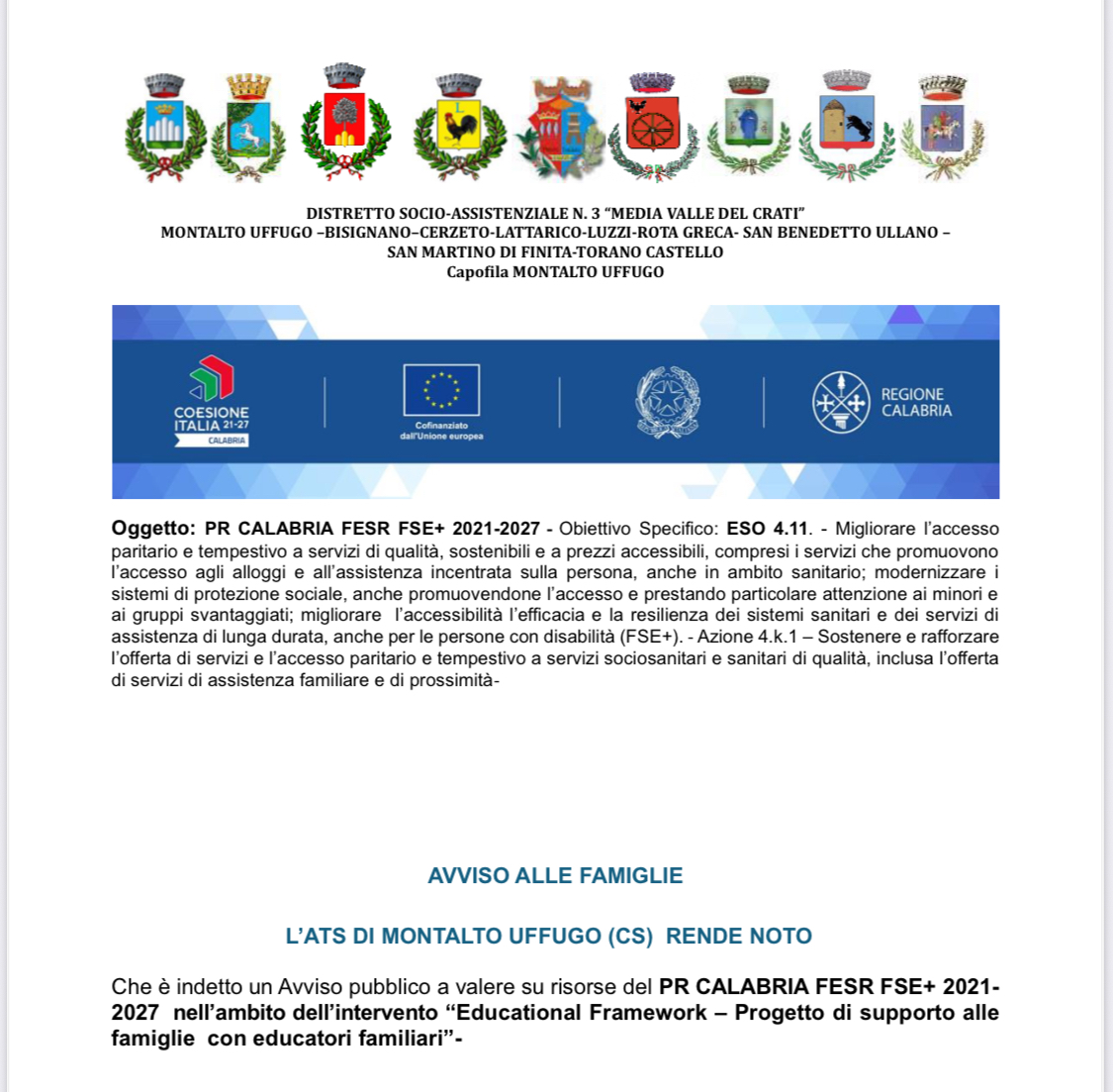Avviso pubblico nell’ambito dell’intervento “Educational Framework – Progetto di supporto alle famiglie con educatori familiari